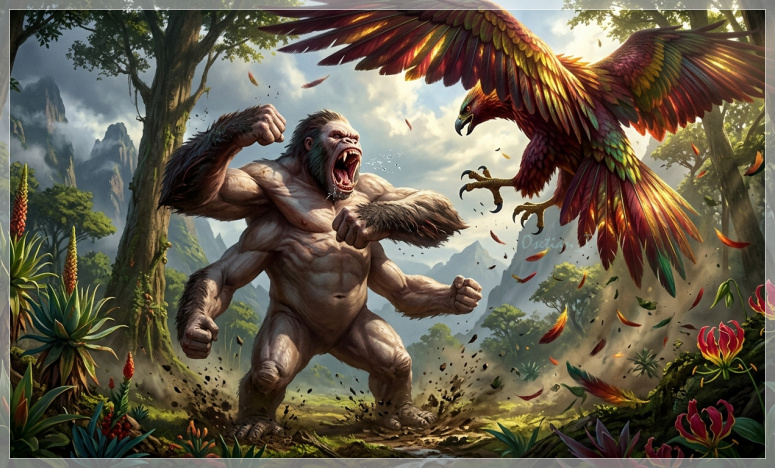 Но тут с неба раздался странный свист и прямо на странного зверя спикировала птица, видеть которую мне ещё не доводилось. Её оперение мягко светилось разноцветными красками и переливалась, словно живой огонь. Зверь зарычал сильнее, и замолотил лапами по воздуху, пытаясь отбиться от когтей птицы, но она ловко уворачивалась, оглушая его крыльями и царапая длинными когтями.