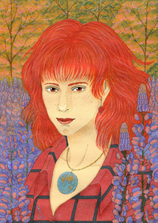 Ей на этой иллюстрации 22-23, мне хотелось изобразить Амелию среди сиреневых люпинов. Я представляла тёплый знойный вечер, золотистые лучи заходящего солнца и слегка прохладный ветер.
