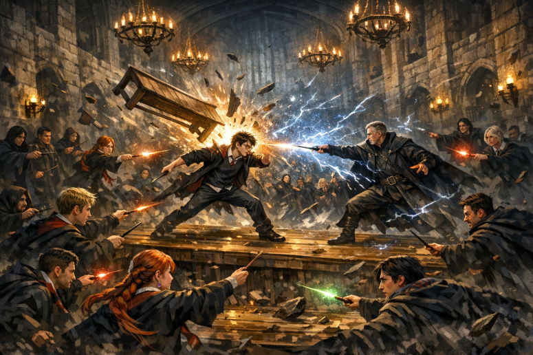 Во время экзамена но ЗОТИ что-то пошло не так. Гарри сходится в яростном поединке с главой Аврората Гавейном Робардсом, демонстрируя невероятную энергию и нестандартную технику.