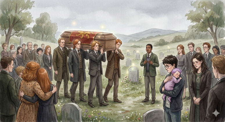На маленьком кладбище в Оттери-Сент-Кэчпоул Артур, Билл, Чарли и Джордж со скорбными лицами несут на плечах гроб Фреда.