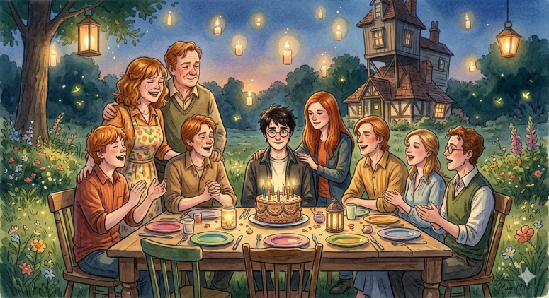 Празднование восемнадцатого дня рождения Гарри в саду «Норы». Все семейство Уизли собралось за большим столом под открытым небом.