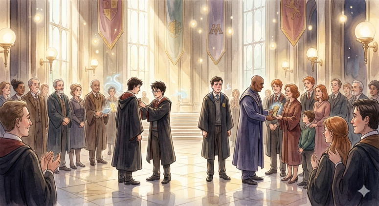 Официальная церемония в Атриуме Министерства магии. Гарри вместе с министром прикрепляет ордена Мерлина на мантии героев войны, среди которых Невилл и члены семьи Уизли, получающие посмертную награду для Фреда.