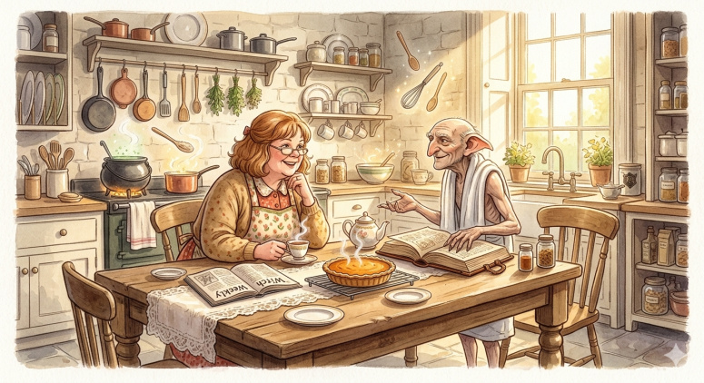 Светлая и обновленная кухня на площади Гриммо. Молли Уизли и Кричер сидят за столом, мирно обсуждая рецепты.