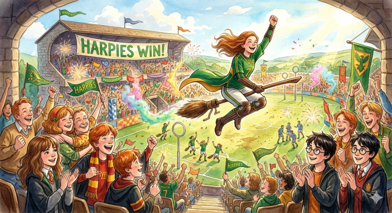 Дебют Джинни. На поле она в зелено-золотой форме «Холихедских гарпий» подлетает к друзьям, сияя от восторга после разгрома «Пушек Педдл».