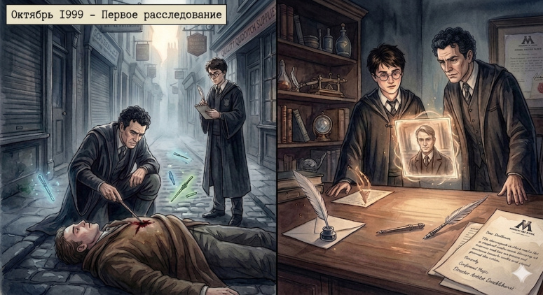 Мрачный рассвет в тупике Косого переулка. Причард осматривает тело убитого, а Гарри рядом фиксирует детали в блокноте.
