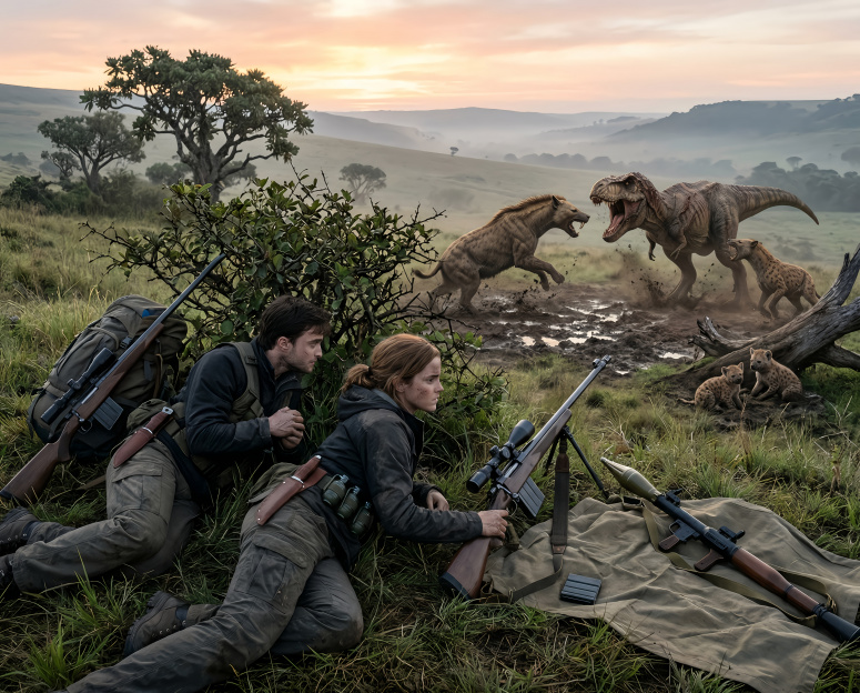 Гарри и Гермиона не охотники ,а наблюдатели-исследователи. Оружие взято на крайний случай самозащиты. Невесть как попавший на миллионы лет вперёд Тираннозавр рекс ультима бьётся насмерть с Мегистотериями, которые защищают детёнышей. Гермиона в этической дилемме: помогать, или нет Мегистотериям?