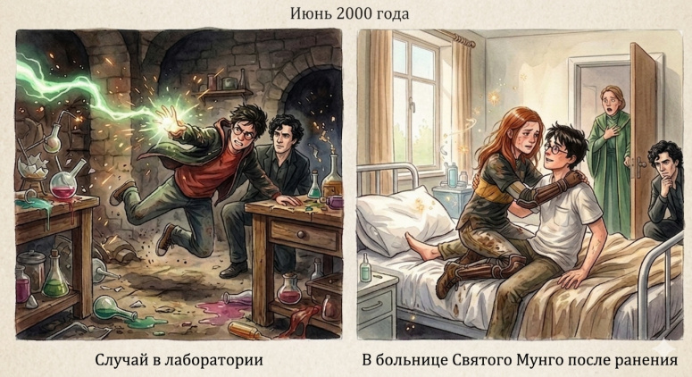 Джинни обнимает Гарри после ранения прямо на больничной койке. На пороге замер возмущенный колдомедик, а Причард в стороне едва сдерживает смех.