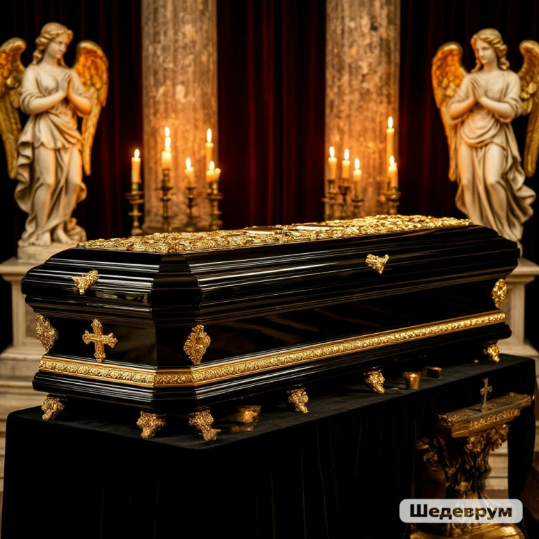 XVIII век. Гроб, украшенный золотым крестом. Вокруг - тёмно-красная драпировка, свечи и статуи ангелов.