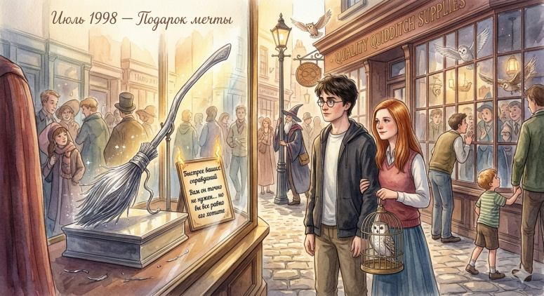 Гарри и Джинни гуляют по Косому переулку с новой совой для Гарри. Перед витриной с новейшей метлой «Великий полководец» Гарри с ностальгией вспоминает «Молнию».