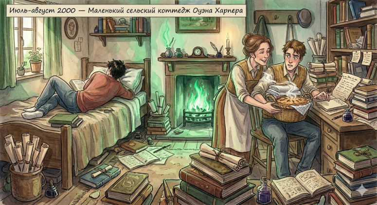 Подготовка к аврорским экзаменам первого года. Гарри по-домашнему устроился на кровати Оуэна с учебником, когда из камина внезапно появляется миссис Харпер с пирогом.