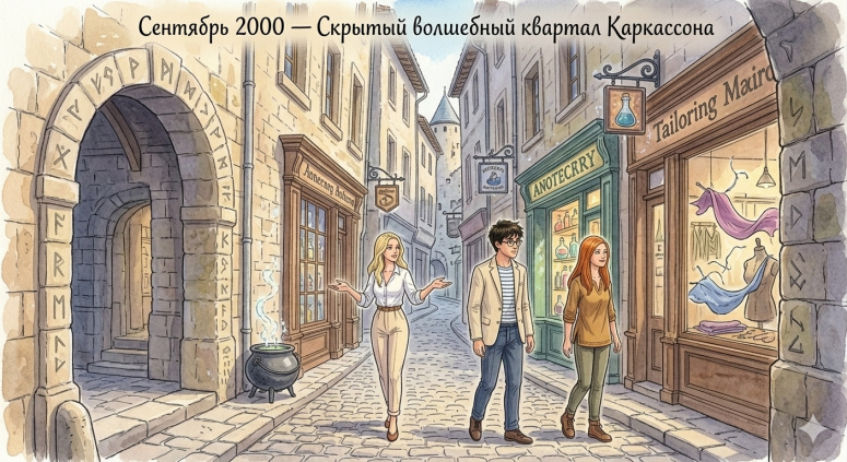 Гарри и Джинни бредут по лабиринту мощеных улочек в скрытой части Каркасона. Мимо мелькают вывески магических аптек с экзотическими ингредиентами и окна швейных мастерских.