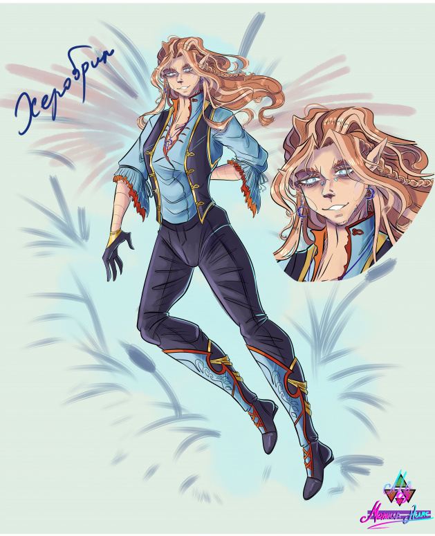 Снова прикоснулась к тому , что рисовала белоглаза. И честно из всех вариантов что были до этого, это по крайне мере выглядит сносно, даже более чем сносно. Как я уже говорила, именно демон проклят на свое изображение. Я знаю как он выглядит у меня в голове, но никак не могу перенести это на холст. У меня даже такой мороки с Эклипсе не было. Сколько Херобрин пережил перерисовок. Но честно и глаза, и прическа в данном варианте суперские. Еще я перешла к минимализму, поэтому не стала вырисовывать заоблачную одежду, а сделала концентрацию на лице и честно, выглядит офигенно. Да и решила сохранить канонный цвет одежды, оставив голубой оттенок рубашки. И да если вы спросите почему вдруг волосы стали немного другого цвета, то виноват Гилд, точнее его единственный раз когда я рисовала наставника. Тот цвет волос мне очень понравился, да и идея белесых полосок еще сыграет свою участь. Та приложу еще старенький рисунок гилда, чтобы вы поняли о чем я говорила.