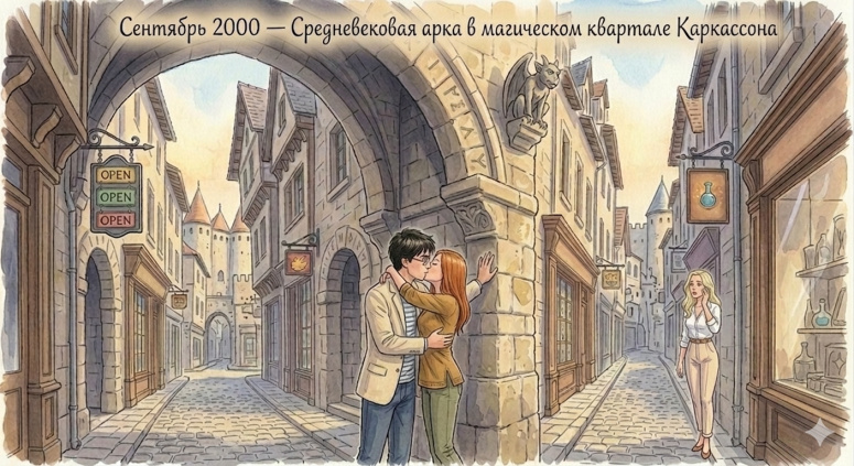 Гарри и Джинни страстно целуются в тени средневековой арки на фоне панорамы Каркасона с его узкими улочками и высокими шпилями.