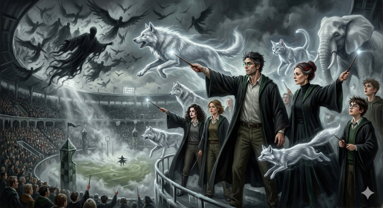 Осень 1974 года. На стадионе под тучей дементоров Гарри, Минерва и дочери с Беллой высоко поднимают палочки. Их патронусы — пес-грим Гарри, кошка Минервы и лиса Беллы — прорезают тьму серебристым светом, защищая зрителей.