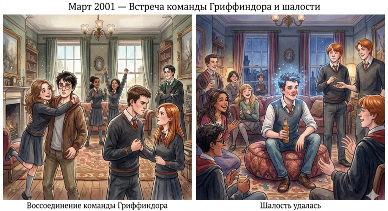 Март 2001 года. На вечеринке Оливер Вуд с синими волосами и свиным носом — жертва шуток Рона и Джорджа — сидит с пивом под общий хохот, пока невозмутимый Рон предлагает ему еще арахиса.