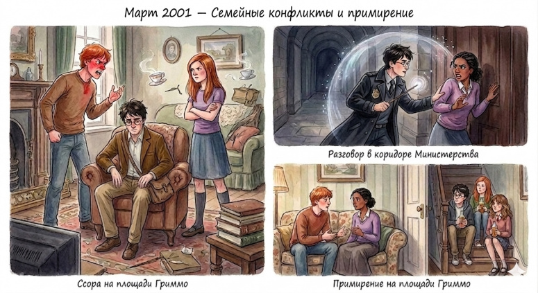 Март 2001 года. Разъяренный Рон в штабе доказывает Гарри и Джинни, что роман Джорджа и Анджелины — это «ненормально». Позже в Министерстве Гарри под чарами тишины прижимает испуганную, но верную своим чувствам Анджелину к стене. В финале Рон и Анджелина мирно беседуют в гостиной, пока Гарри, Джинни и Гермиона подслушивают их с лестницы, попивая сливочное пиво.