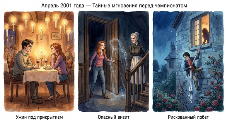 Апрель 2001 года. В ресторанчике Холихеда Гарри под маскировкой ужинает с Джинни при свечах. Позже в лагере «Гарпий» Джинни впускает невидимого Гарри под подозрительным взглядом миссис Норрис. Ночью Гарри сбегает из окна по простыням, пока Джинни наблюдает за его спуском в колючий розарий.