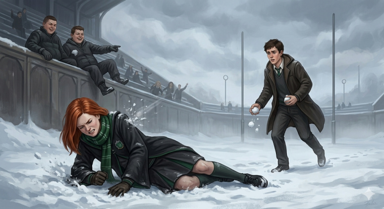 Январь 1996. Предательство своих. Во время снежной битвы, превратившейся в хаос, Джинни падает со сломанной ключицей от ледяного кома Крэбба или Гойла. Томпсон спешит ей на помощь под хохот трибун.