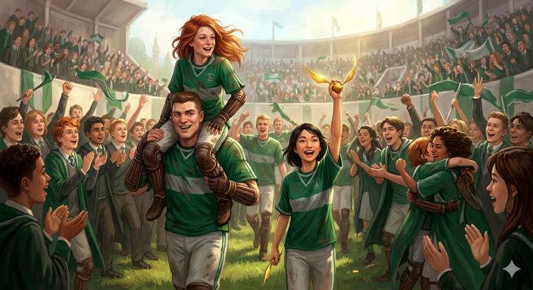 Май 1997. Триумф капитана. На квиддичном поле ликуют слизеринцы: Бассентвейт несет Джинни на плечах сквозь толпу, а Рейко победно вскидывает руку с пойманным снитчем. Это момент долгожданного триумфа команды, которую Джинни выстроила вопреки всему.