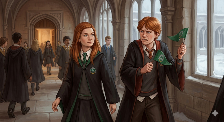 Февраль 1997. Братская поддержка. Перед матчем Рон ворчит на Джинни из-за её капитанства в Слизерине, но та замечает у него в руке крошечный зелёный флажок. Несмотря на соперничество факультетов, Рон признаёт талант сестры и готов поддержать её даже «за вражеской чертой».