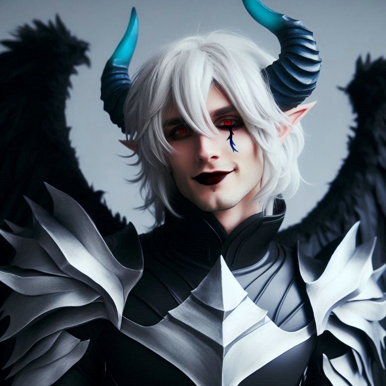 Демон. Белые волосы. рога с синими кончиками. Алые глаза. Тату под глазом в виде тернового ростка. чёрно-серая броня. Чёрные крылья падшего.