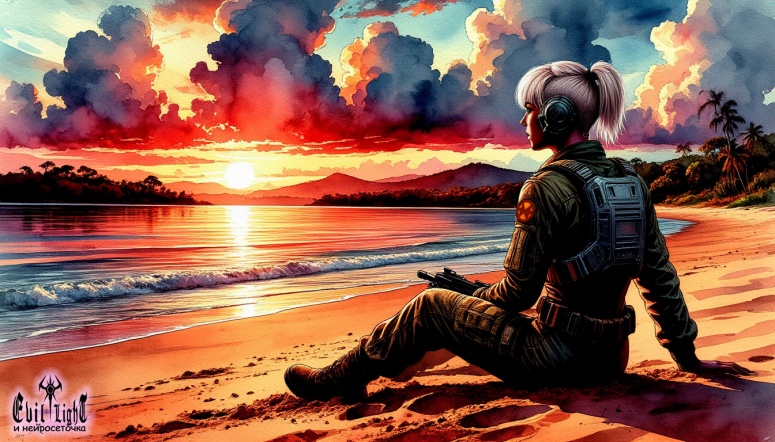 Экзофлотская дезертирка Инга Ильвес отдыхает на берегу дикого озера где-то в венерианских ебенях. Неосапианты за кадром, нейросеточке я их не доверю.