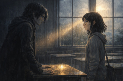 Иллюстрация к первой главе фанфика «Против Течения Времени». Северус Снейп строчит список ингредиентов, а Эйдан Эйвери отвлекает его своей болтовнёй.