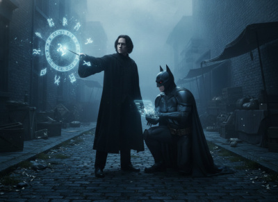 Промпта в этот раз не будет. Так как персонажи генерировались отдельно, а потом склеивались руками в гимпе. И уже полученный "коллаж" был многократно перегенерирован и отинпейнтин. Напоследок шлифанулся постдетализатором, который почему-то распознал лицо Брюса как руку.