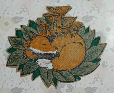 Команда Волки-лисы-собаки 2026. Лиса мирно спит среди грибов-лисичек.