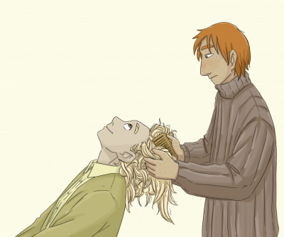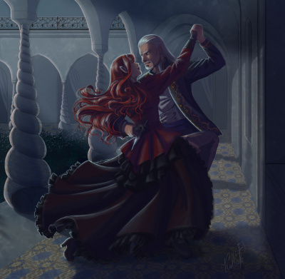 иллюстрация к фентези роману "Истории Морнтаура" и к песне "Даэт". Лимлаг и Сауириэль. Он заигрался с тёмными проклятьями, которые теперь вышли из-под контроля и Сауириэль оказалась единственной, кто может ему помочь справиться с ними и не погибнуть. Она - беглая демоница, наполовину лишённая силы, но не растерявшая навыков. За ней охотятся дроу, которым она перешла дорогу, желая обрести власть. Лимлаг, имея власть и статус может её защитить. Так и вышло, что им пришлось работать друг с другом.