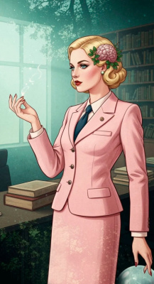 A blonde woman in a 1930s light pink office-style suit, depicted as an office witch with subtle magical attributes and craniocerebral herbs. The image uses a double exposure technique, layering a mystical forest or arcane library over the office environment. Soft, ethereal lighting enhanc