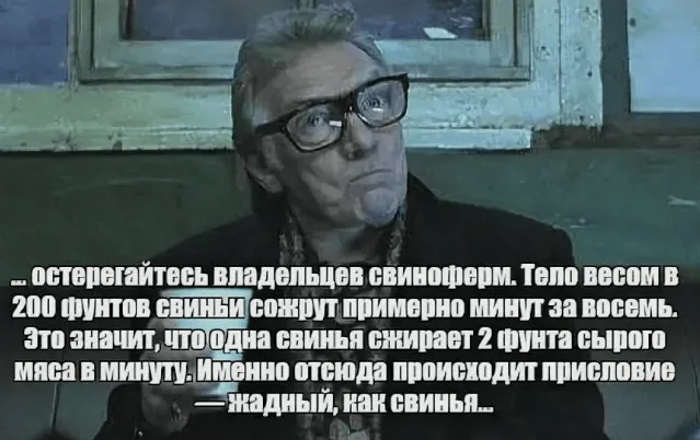 Это на кого ж такую ловушку заготовили? Ждали крупную дичь... Может, на кого-нибудь из вас? У. Макнейр. Птичку, черт, свинку жалко. А. Долохов Создатель Свинке уже всё равно... Netlennaya Я примерно предполагала, что вы так ответите) , но реально, знаете сколько всего необычного и интересного можно сделать во время следственных действий?! По кирпичам и дощечкам можно эту халупу разобрать. Можно. Но цель не в этом ) mlmn больше всего меня восхищает, что Бэддок знает, где в срочном порядке добыть две свиных туши! Он тут знает всё. Вообще всё. И всех. ) Недаром же Лестрейндж его так выделяет Alanna2202 Ele-fantik80 И не говорите!Столько потенциального шашлыка загубили! Агнета Блоссом Alanna2202 АгаСвинке, кажется, уже всё равно, её тушку у мясника приобретали наверняка. клевчук Alanna2202 Но вообще почему загубили? Мясо вроде цело... пока...вот да. 2 |