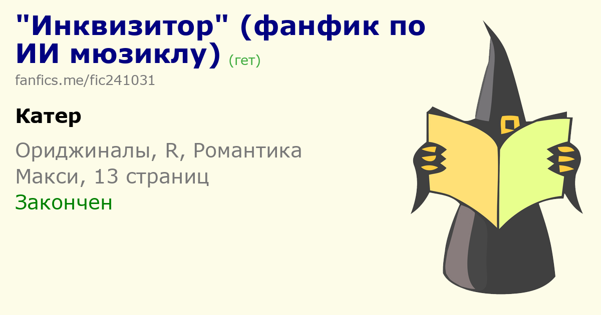Не нашла тут фендома "Инквизитор" ИИ мюзикла за авторством А.Виор и В.Скрипача. В итоге написала как ориджинал. Решила попробовать себя в новом непривычном для себя стихотворном жанре. На все части мюзикла места нет Вот ссылка с первой по третью часть мюзикла в ВК (всего их 15 вышло, жду с нетерпением проду, ну а пока сама альтернативки пишу)