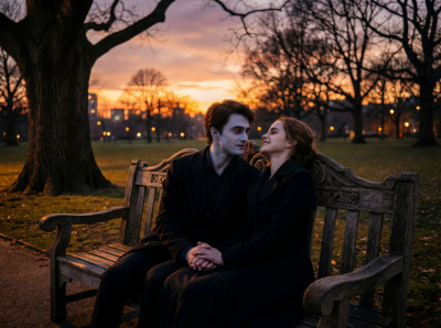 AU. Здесь Гарри и Гермиона- Анна и Максим. На закате солнце окрасило небо в теплые оттенки оранжевого и пурпурного. Анна и Максим сидели на скамейке в парке, наслаждаясь мягким ветерком. Их сердца были полны нежности и ожидания.