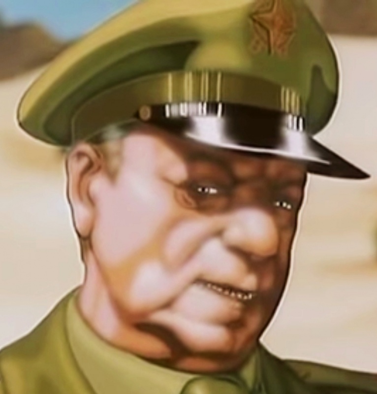 Возглавлял военную комиссию, прибывшую на остров, который стал полигоном для испытания новейшего танка. В мультфильме внешность генерала срисована с французского актёра Жана Габена.