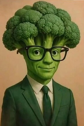 Мужчина с головой в виде брокколи в очках и зелёном костюме с галстуком.