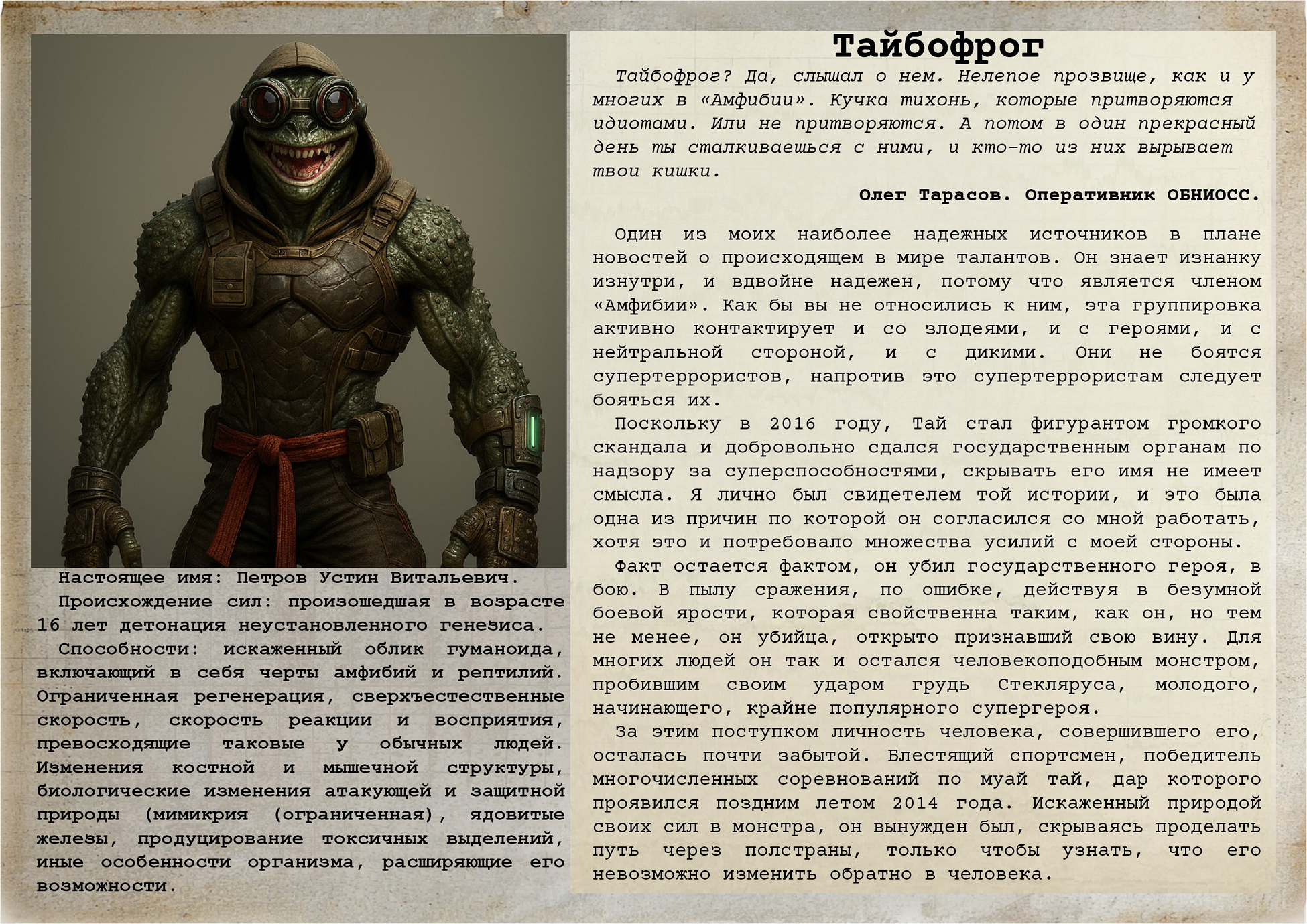 Из жизни земноводных. Цикл статей на сайте theyarenearbyus.int в личных пользовательских блогах. Поскольку недавний скандал с проверками сети «Кружка-Лягушка» на предмет финансовой поддержки ими незаконных талантских группировок, всё ещё на слуху и активно набирает обороты в связи с таинственным происшествием в одном из заведений, а также кадрами где некто одетый, как курьер доставки «Кружки-Лягушки», проявляет явно выраженные сверхспособности, я счёл это достаточной ппричиной, для того чтобы примазаться к сетевому хайпу, и немного осветить для моих подписчиков историю, которая напрямую связана с этими слухами. ![]() Давайте поговорим с вами об «Амфибии». Да, той самой «Амфибии». Группировке клоунов, которую редко принимают всерьёз, что в России, что за рубежом, несмотря на то что, в ней состоят не только кривляющиеся тюнибьё, но и вполне серьёзные международно признанные тяжеловесы и разыскиваемые по подозрению в причастности к актам супертерроризма. Говоря об «Амфибии», следует нырнуть к самым корням зарождения талантам и к появлению в их среде так называемых «гиммиков». Гиммик, как обобщённое определение фишки или тематики группировки, стал использоваться талантами ещё в самом начале их деятельности, уже первые слухи и статьи о костюмированных вигилантах и их противниках позволяли выделить четкие маркеры. Наиболее известными гиммиками стали образы «Каскадёров» и «Пасюков», где образы суперзлодеев опирались на байкерскую и пацанско-панковскую стилистику соответственно. Но и в среде супергероев, выделялся один, который обладал не просто ярким-гиммиком образом, но и философией его трактовки, которая позднее легла в основу убеждений «Амфибии». ![]() Речь конечно же про Древолаза, одного из первых вигилантов Санкт-Петербурга, который в числе нескольких других талантов, известных в среде талантов как «Дружина», заложил основы образа и поведения для супергероев. Речь идет конечно о мануале по созданию экипировка, костюма и тактике действий в городской и пригородной среде, книги известной, как настольная книга для многих начинающих талантов (в том числе и государственных), за автором ЛОДЧК. Довольно очевидно, что несмотря на то что каждый из них открещивался от её создания, авторы этого мануала несомненно либо были близки к таким талантам как Легионер, Опричник, Древолаз и Чёрный Кот, либо и вовсе в какой-то период активно работали под образом этих талантов. Как бы то ни было, Древолаз был идейным вдохновителем «Амфибии», не только как символ, ради которого некоторые из них прибыли в город, но и как собственно идея и философия группировки. Это уникальный случай, когда у нас есть дословная цитата таланта, объясняющего свой образ и никнейм. ![]() «Дуализм образа, двойственность восприятия. Называйте это, как хотите. Одни люди считают, что лягушки мерзкие, осклизлые и противные. Другие видят эстетику в их движении, динамику и скорость реакции, эволюционное решение для эффективной охоты. Одни считают их глупыми и холоднокровными, другие восторженно наблюдают за трансформациями их развития. Древолаз сочетает в себе оба этих качества. Это одновременно одна из самых красивых лягушек, но в тоже время одно из самых ядовитых существ на планете. Они малозаметные, потому что небольшие, но в тоже время яркие и броские, предупреждающие о том, что опас