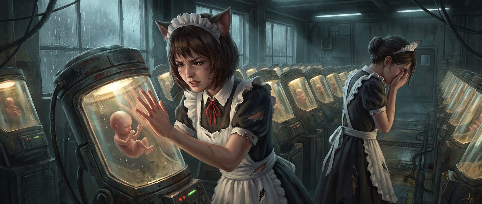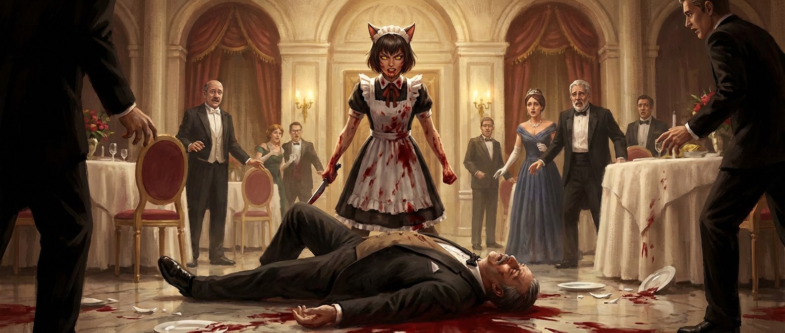 Лина и Мира: Проект «Фавн» Сцена в зале "Золотой Клетки", когда их на смотрины одели горничными. Нервосетка нарисовала пистолеты и я забраковал эту иллюстрацию ![]() |