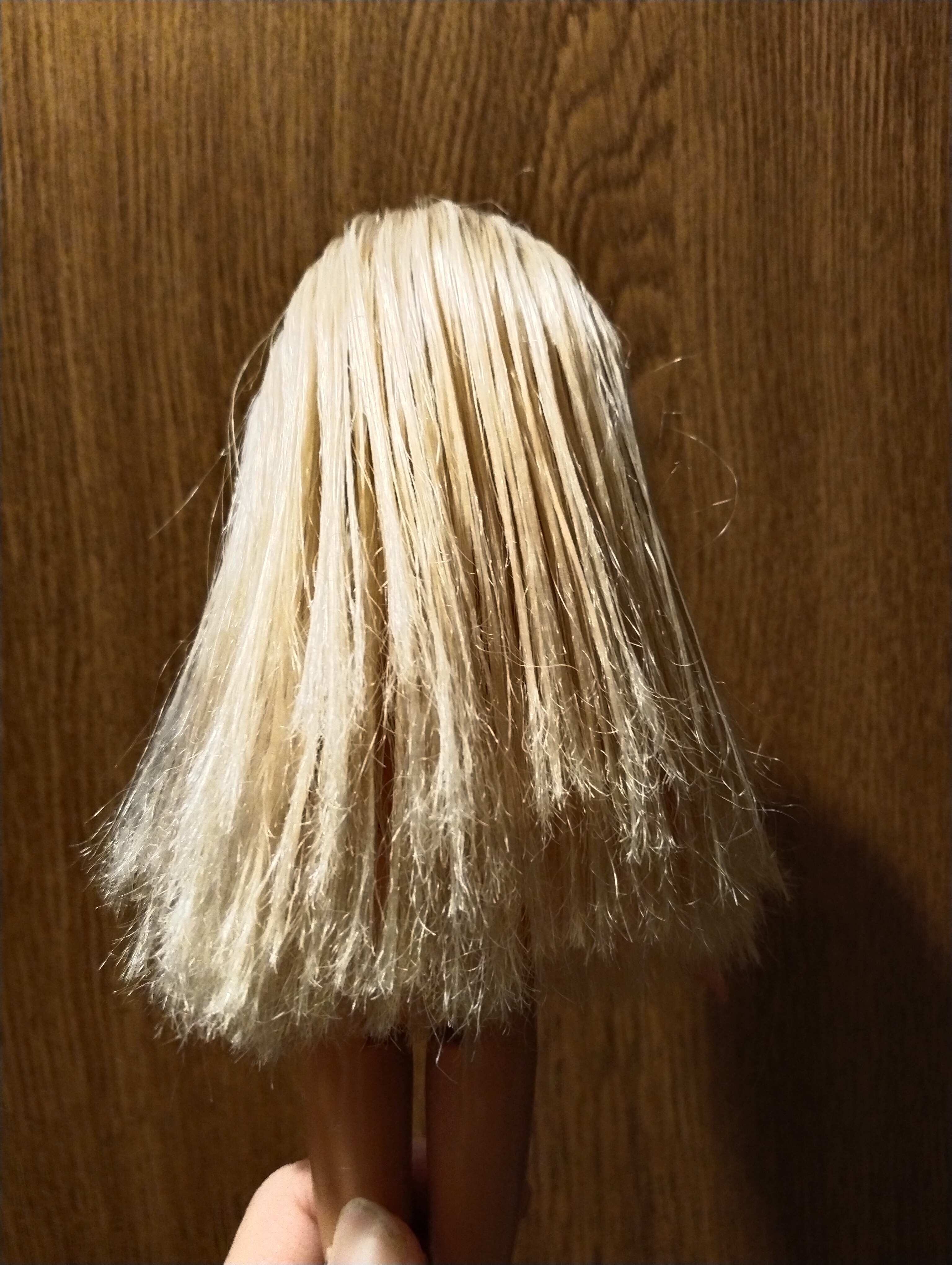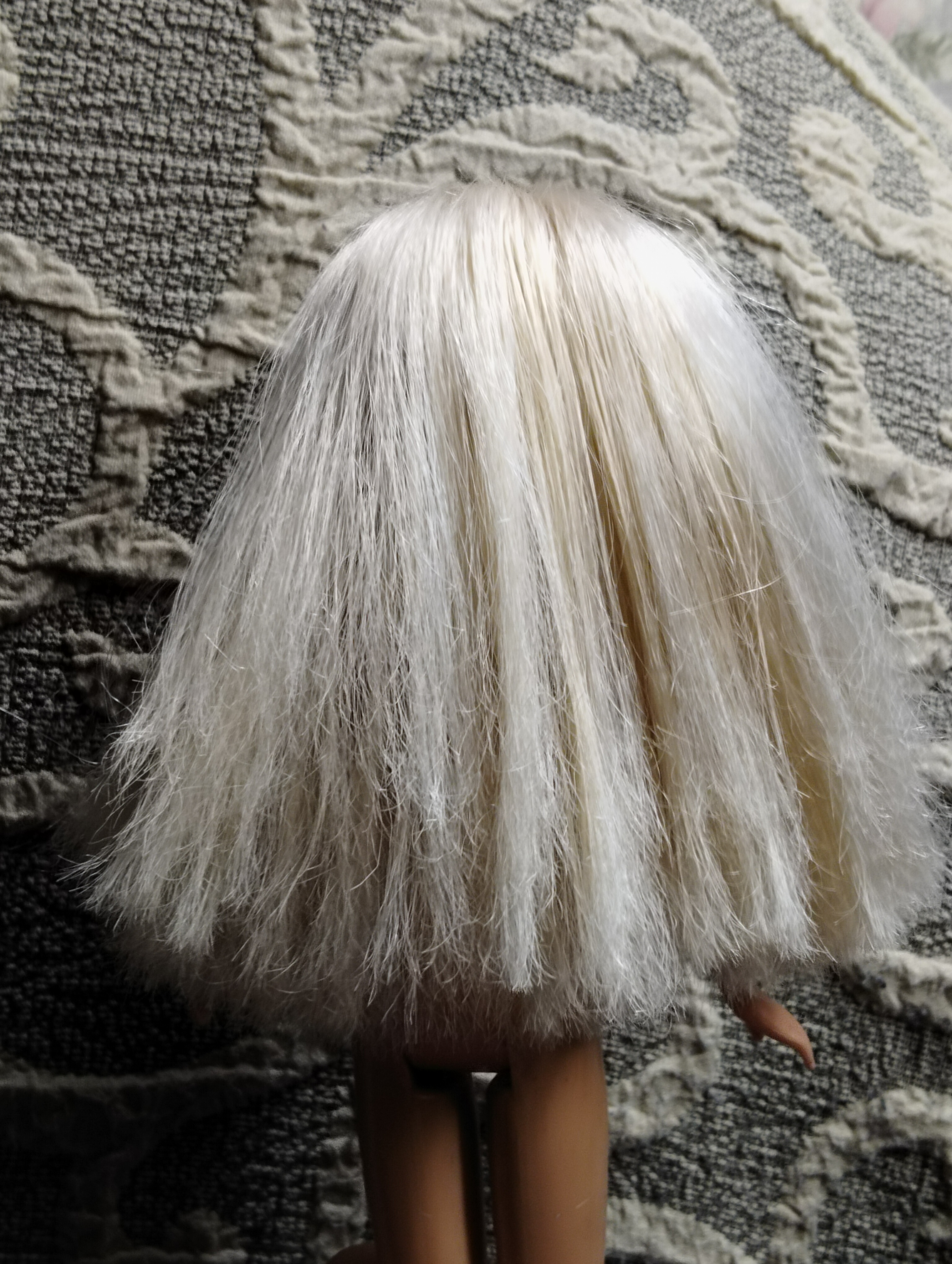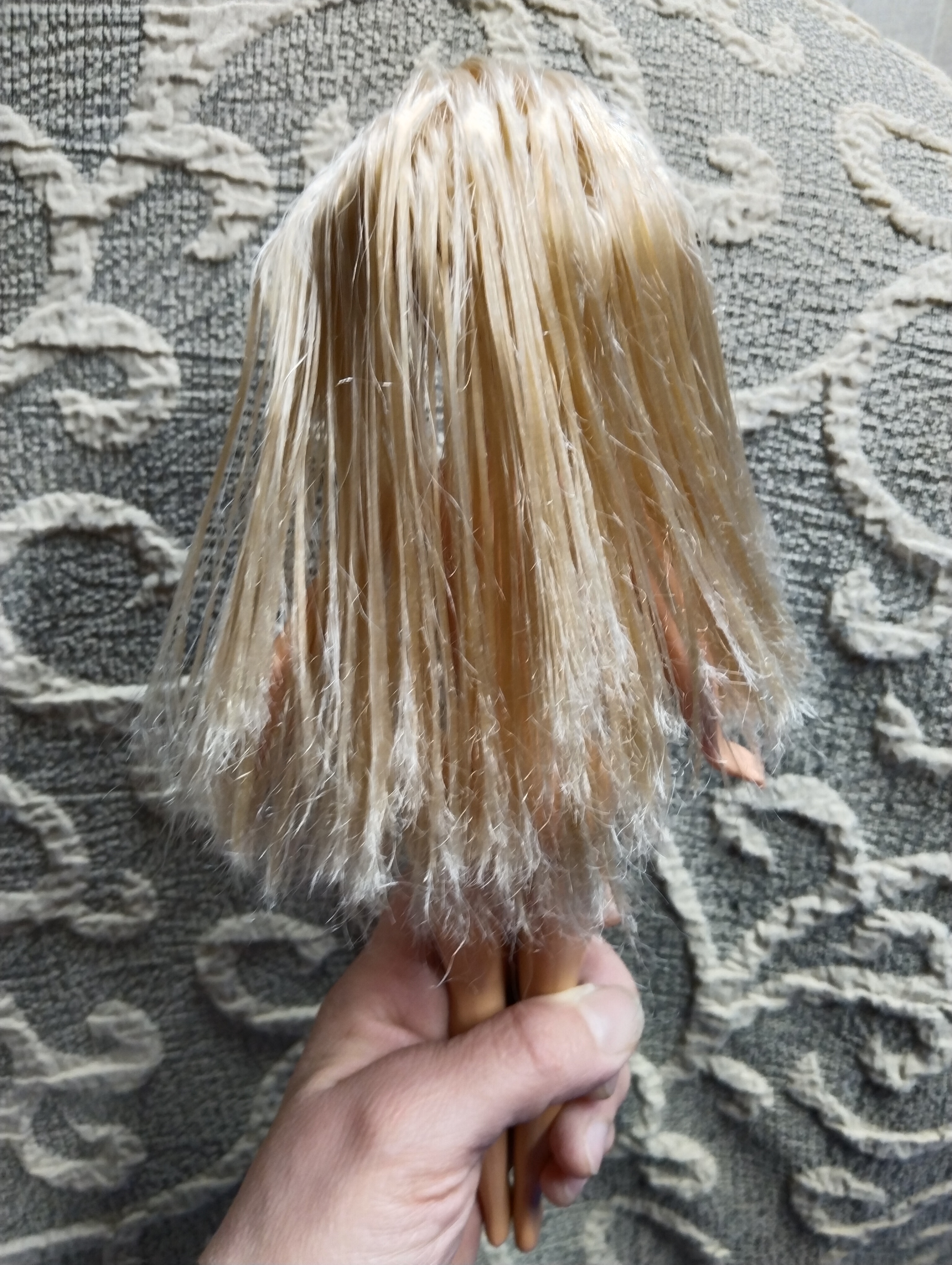 Итак. Поскольку болезнь прогрессирует, решила помыть волосы моей Габби, поскольку она блондинка, то особо заметны все беды и косяки с ними. Волосье было грязное (30 лет барышня пылилась на полке и неизвестно, мыли ли их воще) и очень колтунистое. Это будет рекламы фирмы Синергетик псто. Потому что мыла волосы я их гипоаллергенным средством для мытья посуды. А ополаскивала их кондиционером для белья. Пойду по порядку. Волосы у этой Барби очень пухлявые и очень сильно электролизуются. Расчесать их было нереально. Также они посеклись на концах, что мешало расчесыванию. Сначала я прополоскала волосы Габби в кипятке. Саму голову и челку не мочила. Вдруг там клей или что. Потом прямо в воде пыталась расчесать. Это было очень трудно. Далее помыла с средством для мытья посуды, чтобы грязь смыть. Расчесать по прежнему сложно. А потом приступила к самому сложному и нудному этапу: отмачиванию в кондиционере. Воду я сделала теплую, плюхнула туда колпачок средства и около часа полоскала там волосы Габби, одновременно их расчесывая. Постепенно, где-то мин через сорок, волосы сдались и перестали путаться. Я их прополоскала и просушила салфеткой. И расчесала опять. Обнаружилась частая беда - волосы на концах посеклись как пакля и из-за этого спутывались. Пришлось аккуратно постричь кончики, заодно выровнять прическу. Там были места, как будто уже ее кто-то стриг (может и стригли. Я ж не первый ее владелец). Подровняла и их. И она преобразилась! Волосы стали послушные, мягкие, чудесно пахнут и не магнитятся! Вуаля! Габби перестала выглядет как китайская рублевая барби. Фото будут чуть позже! 8 декабря в 22:32