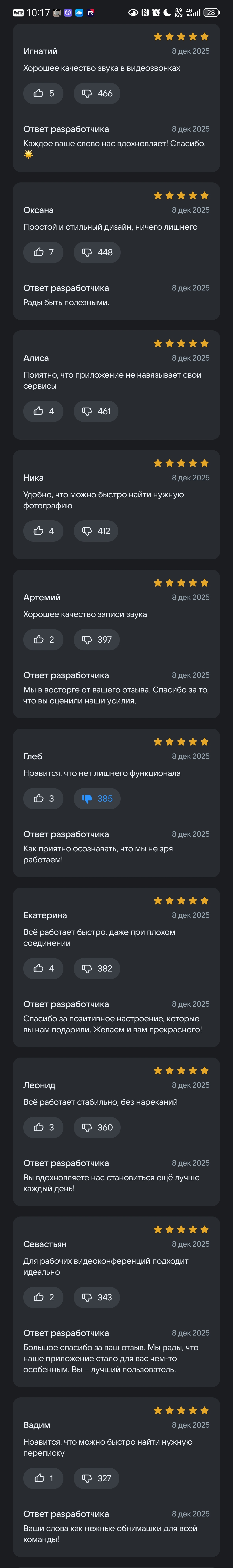Зашёл специально посмотреть. Это так кринжово выглядит, если словом «кринж» заменять словосочетание «испанский стыд». Имена пользователи, наверное, брали из дореволюционных святцев. Сам отзыв, как правило, состоит из одной строчки, где восхваляется что-то одно. Под отзывом — «ответ разработчика», который выглядит ещё более кринжово, чем всё предыдущее, как правило, этот ответ невпопад с какой-то примесью флирта, что ли... «Стараемся только ради вас», «вы — наш главный клиент» и так далее. Причём отзывы идут волнами, например, если 1 отзыв начинается со слова «приятно», то следует ожидать 5-6 отзывов, начинающихся с этого слова. Всё это выглядит мразотно и оставляет ужасное послевкусие. Лучше бы они просто негативные отзывы удалили бы и всё, не подменяя их на это глумление и уродство. Я написал отзыв, но вряд ли он пройдёт модерацию. 10 декабря 2025