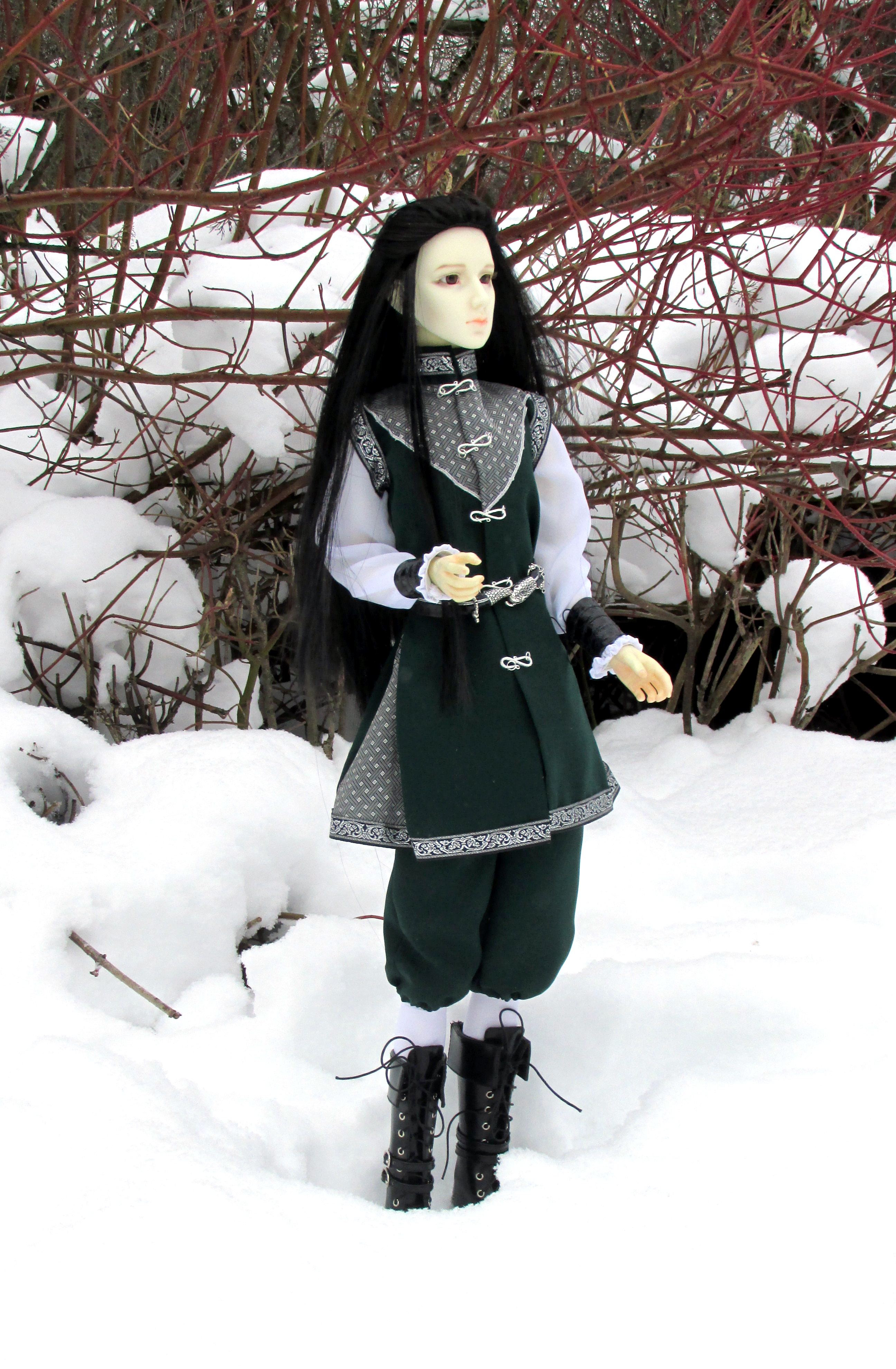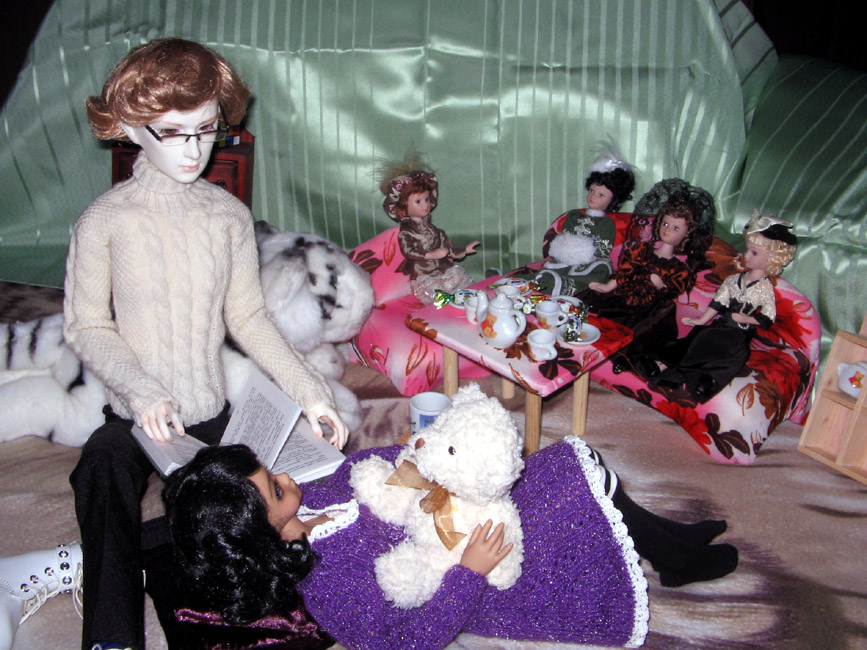 Собственно, о свой оридж я и споткнулся. Там много мужских персонажей – куда больше, чем женских, – а в кукольном мирке все как раз наоборот. Но самое главное, вот этот маленький Эжен, который 1/6, совершенно не подходил под образ. Я перепрошил ему волосы, сделал костюм, даже на перерисовку лица отдал – но все равно это был не он. Было НЕ ТО. Меня давно подбивали присмотреться к БЖД. Я все отбрыкивался: ну какие БЖД? Они дорогущие, и лица у них у всех такие, что типа «мы все высшая каста, а вы так, грязь под ногами». К тому же с работой у меня в то время было плоховато… Но все-таки звезды сложились. Мои накопления + надаренное на ДР (вот всегда говорил, что лучший подарок – это деньги ) Фиг бы мне кто БЖД подарил, а с миру по нитке – набралось!), к тому же мне помогли найти молд, который не полыхал бы презрением к обычным людям… И однажды у меня появился мой король ) Вот он, Эжен-2, 72 см королевского достоинства: ![]() Это уже конечный вариант, а первоначально тело у него было поменьше, и к этой голове не очень подходило. На работу я к тому времени уже устроился, поэтому помялся, ужался… И купил Эжену новое тело, а старому телу – новую голову. И стало их у меня двое: ![]() Вот такая наглая рыжая морда: ![]() На исторические костюмы для столь больших парней я все никак не мог раскачаться, поэтому ходили в стиле «модерн!AU» (Эжену я даже второй парик приобрел – с короткой стрижкой, чтобы постоянно королевские кудри не трепать). Но курточкой этой я прямо доволен – вспомнить бы еще, как именно я ее вязал и повторить бы для кое-кого… Но второй парень у меня не прижился. Очень уж он ревновал своего короля и очень ему не нравилось то, что я про него писал. Всегда был далек от того, чтобы одушевлять кукол, но конкретно эта рыжая скотина так буравила мне затылок своим мстительный взглядом, что я помучился где-то с полгода – и продал его. От греха подальше по частям: тело в Москву, а голову аж в Калининград ) Но так как от продажи у меня образовались деньги, которые вроде как официально кукольные, я решил приобрести себе кое-кого безопасного, а именно маленькую девочку. ![]() Она тоже часть ориджа, но там довольно запутано, поэтому не буду сейчас лезть в дебри. Скажу лишь, что она дочь той Снежаны, что в первой части красовалось в бело-синем платье. По кукольной истории ее временно направили к Эжену, который биологически ей никто (что логично по внешности )) – но просто «мамин друг детства». Ну и плюс Снежане Эжен в принципе не умеет отказывать. ![]() Дарина живет неплохо. Одних собственных кукол у нее выше крыши ) ![]() Но куда больше она любит мишек. И разные истории. ![]() Впрочем, читать она и сама умеет. ![]() А вот такой закуточек у моих БЖД. Это один из прошлых новогодних праздников – нынче, увы, у меня все так завалено, что и маленькую елочку приткнуть некуда. Но я все же надеюсь, что однажды у меня будет места побольше… ![]() А еще Эжен успел поучаствовать в паре Фандомных Битв ) В 2014 (или 2015?) он отыграл Филиппа V для команды «Проклятых королей»: ![]() А в, если не ошибаюсь, 2017 – Салазара Слизерина для команды Основателей. Последнее получилось хуже, ибо забыли хотя бы фотошопом хоть брови обработать – и блондин в роли брюнета отчаянно палится ) ![]() А еще я не успел сделать ему мантию (позор!), но зато успел сделать "медальон" ) ![]() вчера в 07:54