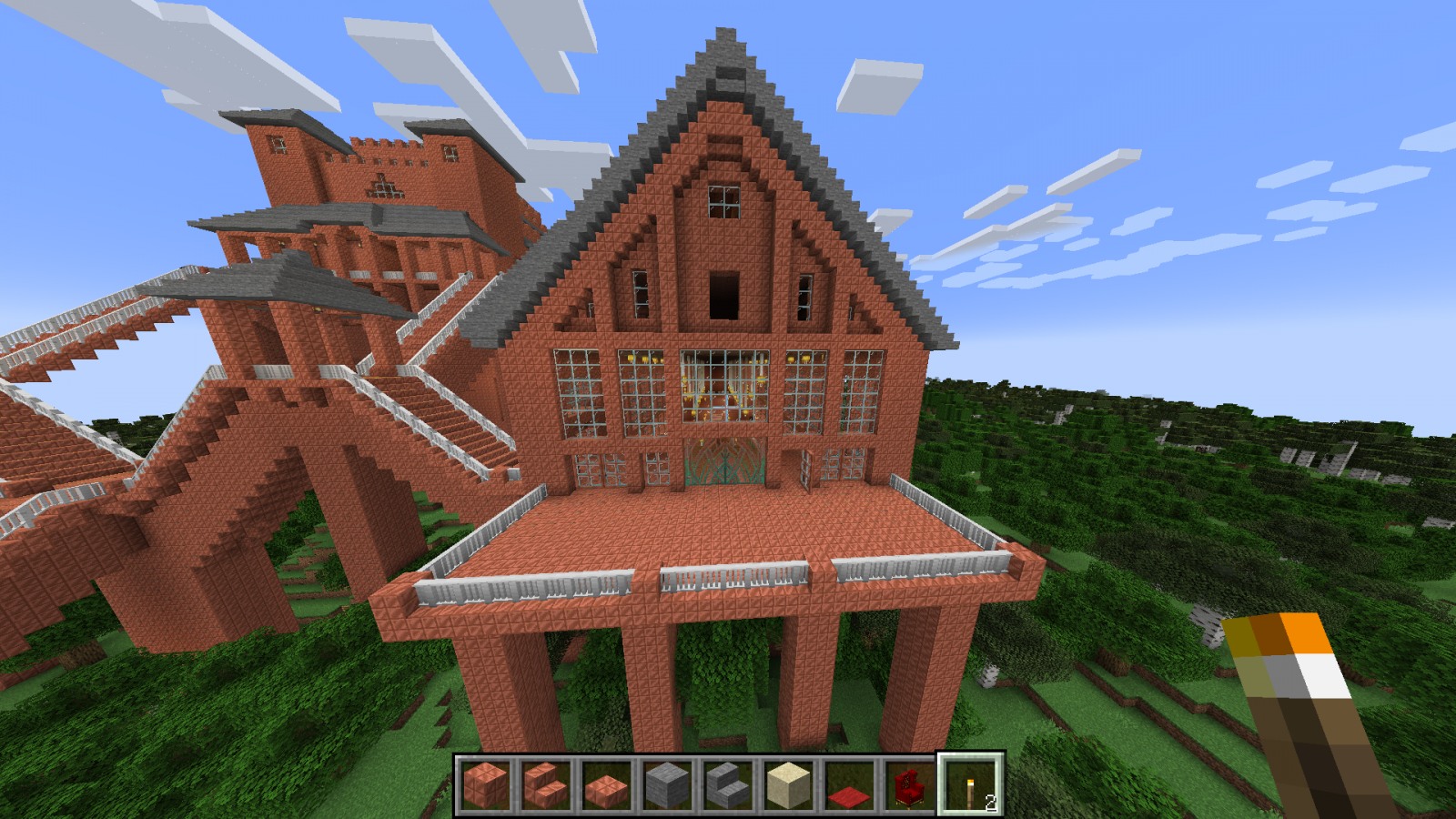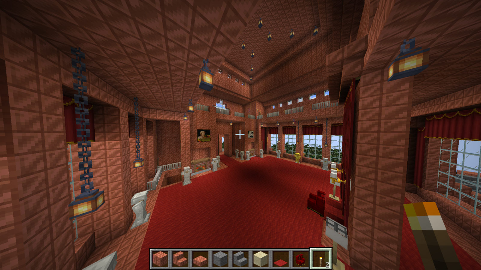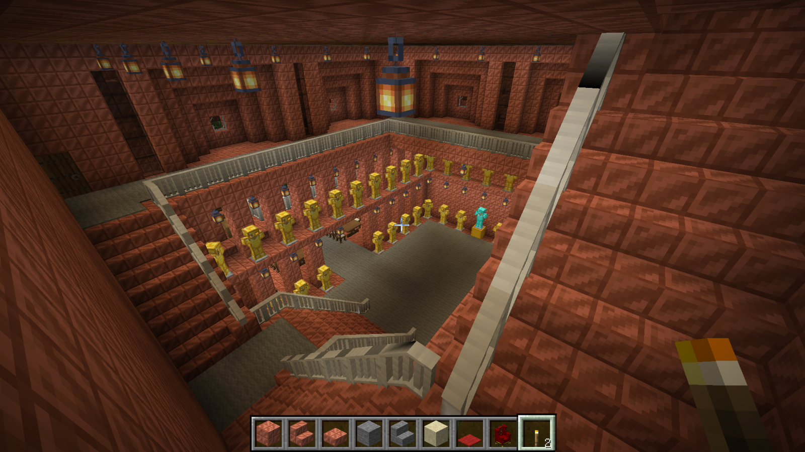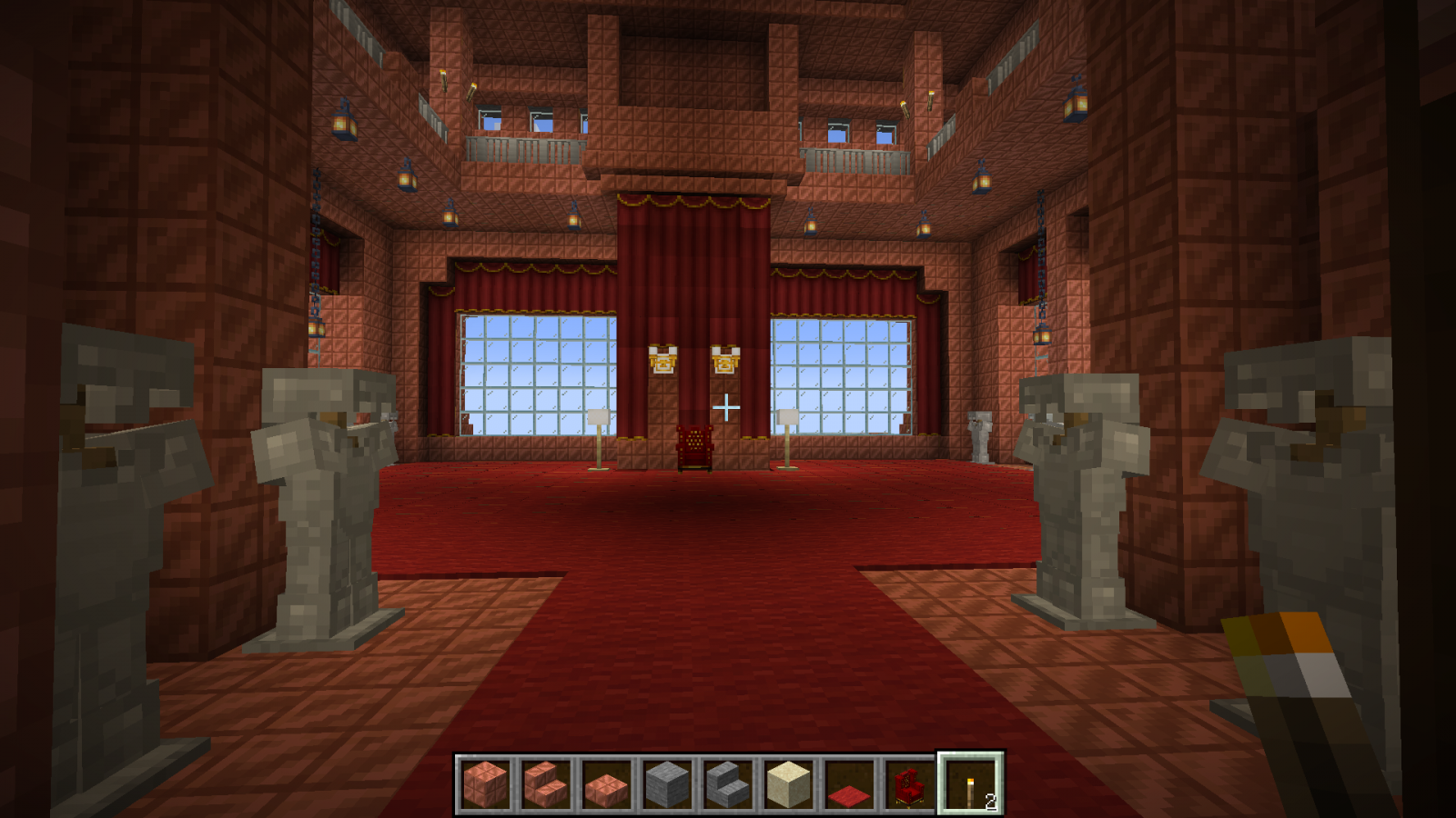 Бог за семь дней создал мир или как там в каноне, я за семь дней ещё не закончил со своим замком в майнкрафте. Ставил игру Волди, случайно залез сам. Вот тут был первый пост 4 дня назад и первые скриншоты. Так как меня упороло в строительство, то упорюсь и в составление документации. Сейчас будет долгое перечисление, возможно кто-то его даже прочитает :) Итак, замок пока состоит из трёх строений Слева направо: жилой корпус, донжон и бальный зал с пристроенным банкетным залом.1. Жилой корпус состоит из пяти этажей. - первый этаж: кухня и склады - второй этаж: 18 комнат для прислуги и работников замка, ванная комната, три туалета, две (мужская и женская) душевые на три кабинки каждая + раковины, два технических помещения - третий этаж: трое гостевых двухкомнатных апартаментов со своим санузлом каждые - четвёртый этаж: парадный кабинет короля, приёмная перед кабинетом, кабинет главного министра, кабинет казначея, личный кабинет короля, казна, разделённая на две части, одна доступна казначею, вторая только королю - пятый этаж: гостиная короля и королевы, спальня короля и королевы (ванная, два туалета, гардеробная), зимний сад - чердак Между тремя верхними этажами есть внешняя лестница, начинающаяся в тронном зале донжона и есть парадные лестницы. Между всеми пятью этажами есть скрытые лестницы для прислуги, со своего этажа прислуга может попасть на любой этаж, ни разу не выходя в парадные помещения и коридоры. Есть тайные ходы из спальни короля: в донжон, в личный кабинет, оттуда в официальный кабинет, на улицу и в подземный ход, откуда потом можно попасть в любое здание замка и на улицу несколькими способами, можно ещё выйти на крышу, перейдя по ней, попасть в донжон через специальную дверку. Из кухни есть подземный ход в донжон в гостиную-столовую и на первый этаж, есть подземный ход в банкетный зал. 2. Донжон состоит из э... 10(11) уровней! - первый уровень - пока не обустроен, запланирована казарма, темница и склады - второй уровень - столовая-гостиная и кабинет для переговоров - третий уровень - библиотека и большой лестничный холл - - перечисленные выше помещения второго и третьего уровней занимают меньше половины площади каждого уровня, в высоту они по 6 блоков. На оставшейся площади эти этажи поделены на три уровня (поэтому указано 11 уровней в скобках) - 4, 4 и 3 блока высотой, там размещаются технические помещения: склады, кладовки, кабинеты управляющего замком, завхоза и тому подобное. Это нужно для оптимизации использования доступных площадей и для сокрытия в переплетениях мелких помещений и переходов сокровищницы, доступ в которую есть только с четвёртого уровня. - четвёртый уровень - главный этаж зала героев, казарма личной стражи короля, столовая и комната отдыха личной стражи короля - пятый уровень - комнаты офицеров личной стражи короля и второй свет зала героев - шестой уровень - третий свет зала героев (смотри скриншот с кучей золотых манекенов, это и есть трёхуровневый зал героев) - седьмой уровень - тронный зал и большой балкон - восьмой уровень - балкон тронного зала, второй свет тронного зала - девятый уровень - внешний балкон и третий свет тронного зала - десятый уровень - крыша донжона Открытые парадные лестницы соединяют: тронный зал, зал героев, этаж библиотеки и этаж столовой-гостиной. Из столовой-гостиной есть максимально короткий проход в под
