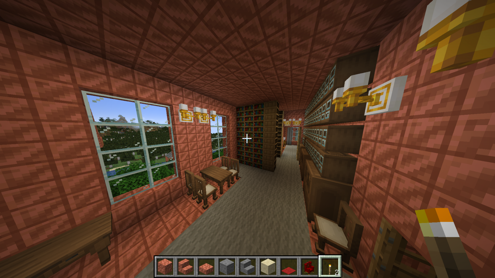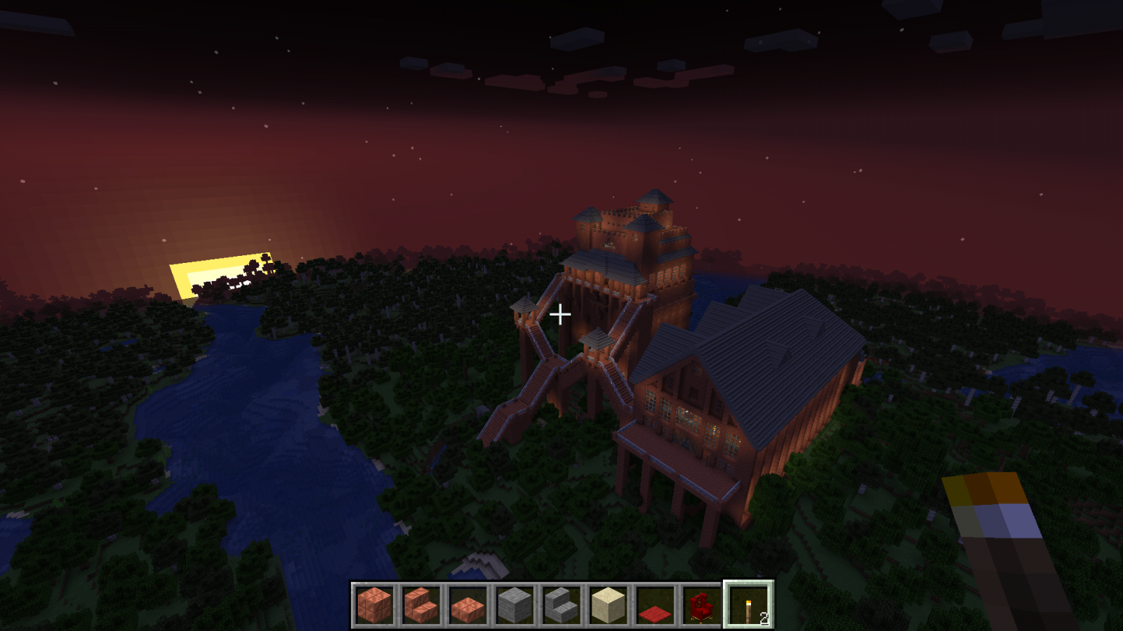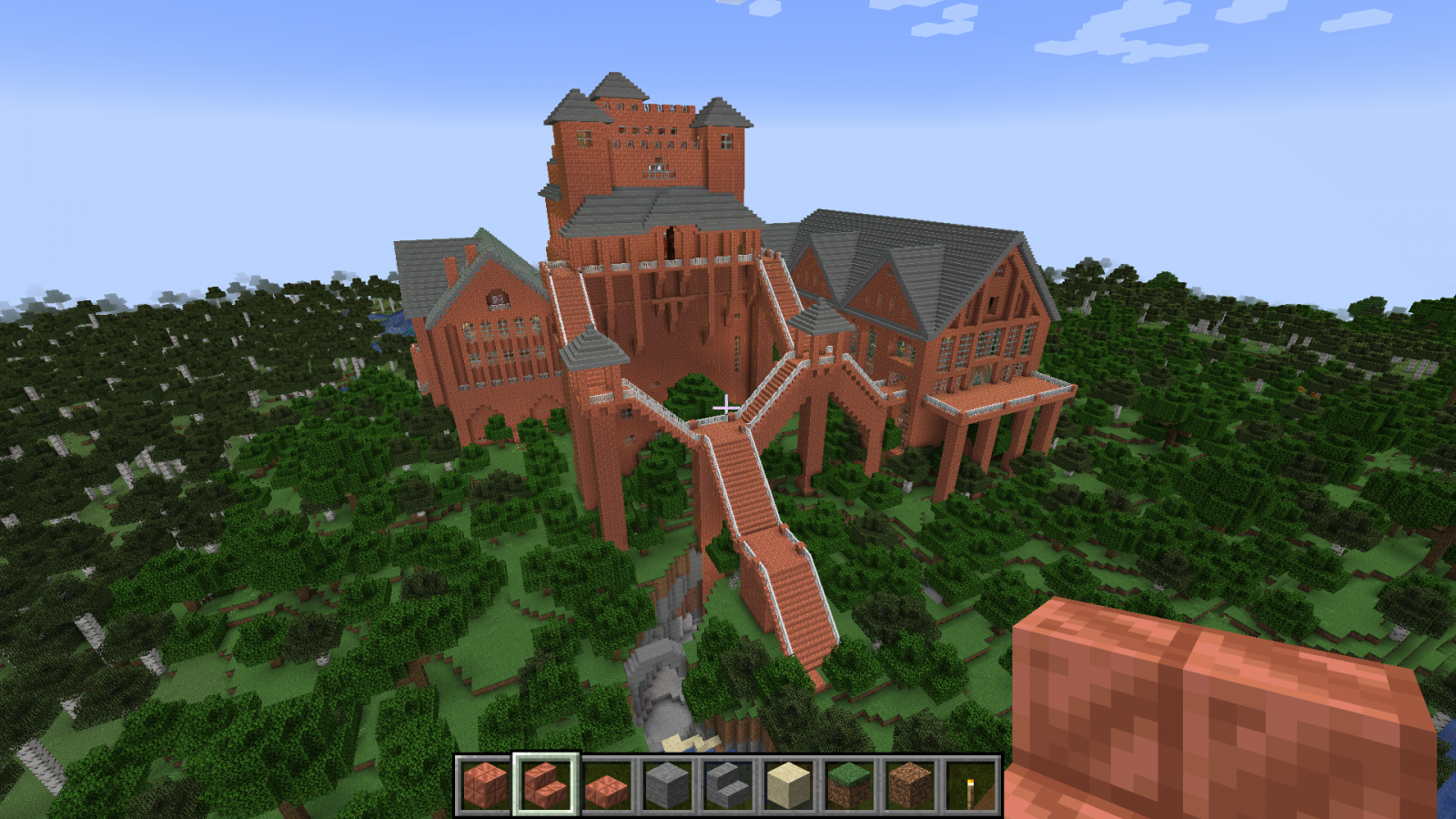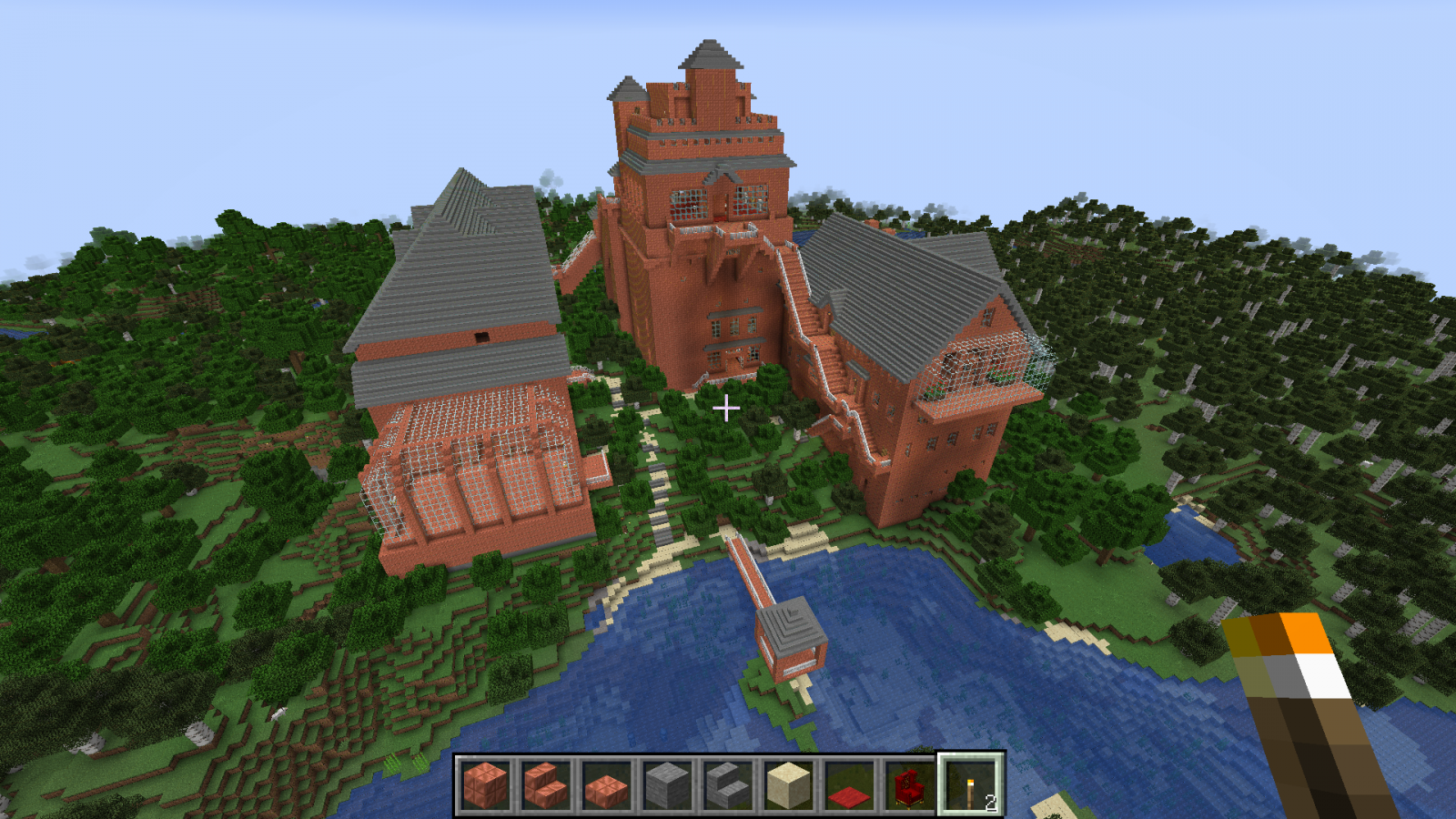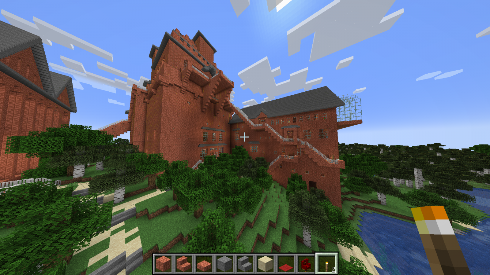 Бог за семь дней создал мир или как там в каноне, я за семь дней ещё не закончил со своим замком в майнкрафте. Ставил игру Волди, случайно залез сам. Вот тут был первый пост 4 дня назад и первые скриншоты. Так как меня упороло в строительство, то упорюсь и в составление документации. Сейчас будет долгое перечисление, возможно кто-то его даже прочитает :) Итак, замок пока состоит из трёх строений Слева направо: жилой корпус, донжон и бальный зал с пристроенным банкетным залом.1. Жилой корпус состоит из пяти этажей. - первый этаж: кухня и склады - второй этаж: 18 комнат для прислуги и работников замка, ванная комната, три туалета, две (мужская и женская) душевые на три кабинки каждая + раковины, два технических помещения - третий этаж: трое гостевых двухкомнатных апартаментов со своим санузлом каждые - четвёртый этаж: парадный кабинет короля, приёмная перед кабинетом, кабинет главного министра, кабинет казначея, личный кабинет короля, казна, разделённая на две части, одна доступна казначею, вторая только королю - пятый этаж: гостиная короля и королевы, спальня короля и королевы (ванная, два туалета, гардеробная), зимний сад - чердак Между тремя верхними этажами есть внешняя лестница, начинающаяся в тронном зале донжона и есть парадные лестницы. Между всеми пятью этажами есть скрытые лестницы для прислуги, со своего этажа прислуга может попасть на любой этаж, ни разу не выходя в парадные помещения и коридоры. Есть тайные ходы из спальни короля: в донжон, в личный кабинет, оттуда в официальный кабинет, на улицу и в подземный ход, откуда потом можно попасть в любое здание замка и на улицу несколькими способами, можно ещё выйти на крышу, перейдя по ней, попасть в донжон через специальную дверку. Из кухни есть подземный ход в донжон в гостиную-столовую и на первый этаж, есть подземный ход в банкетный зал. 2. Донжон состоит из э... 10(11) уровней! - первый уровень - пока не обустроен, запланирована казарма, темница и склады - второй уровень - столовая-гостиная и кабинет для переговоров - третий уровень - библиотека и большой лестничный холл - - перечисленные выше помещения второго и третьего уровней занимают меньше половины площади каждого уровня, в высоту они по 6 блоков. На оставшейся площади эти этажи поделены на три уровня (поэтому указано 11 уровней в скобках) - 4, 4 и 3 блока высотой, там размещаются технические помещения: склады, кладовки, кабинеты управляющего замком, завхоза и тому подобное. Это нужно для оптимизации использования доступных площадей и для сокрытия в переплетениях мелких помещений и переходов сокровищницы, доступ в которую есть только с четвёртого уровня. - четвёртый уровень - главный этаж зала героев, казарма личной стражи короля, столовая и комната отдыха личной стражи короля - пятый уровень - комнаты офицеров личной стражи короля и второй свет зала героев - шестой уровень - третий свет зала героев (смотри скриншот с кучей золотых манекенов, это и есть трёхуровневый зал героев) - седьмой уровень - тронный зал и большой балкон - восьмой уровень - балкон тронного зала, второй свет тронного зала - девятый уровень - внешний балкон и третий свет тронного зала - десятый уровень - крыша донжона Открытые парадные лестницы соединяют: тронный зал, зал героев, этаж библиотеки и этаж столовой-гостиной. Из столовой-гостиной есть максимально короткий проход в под