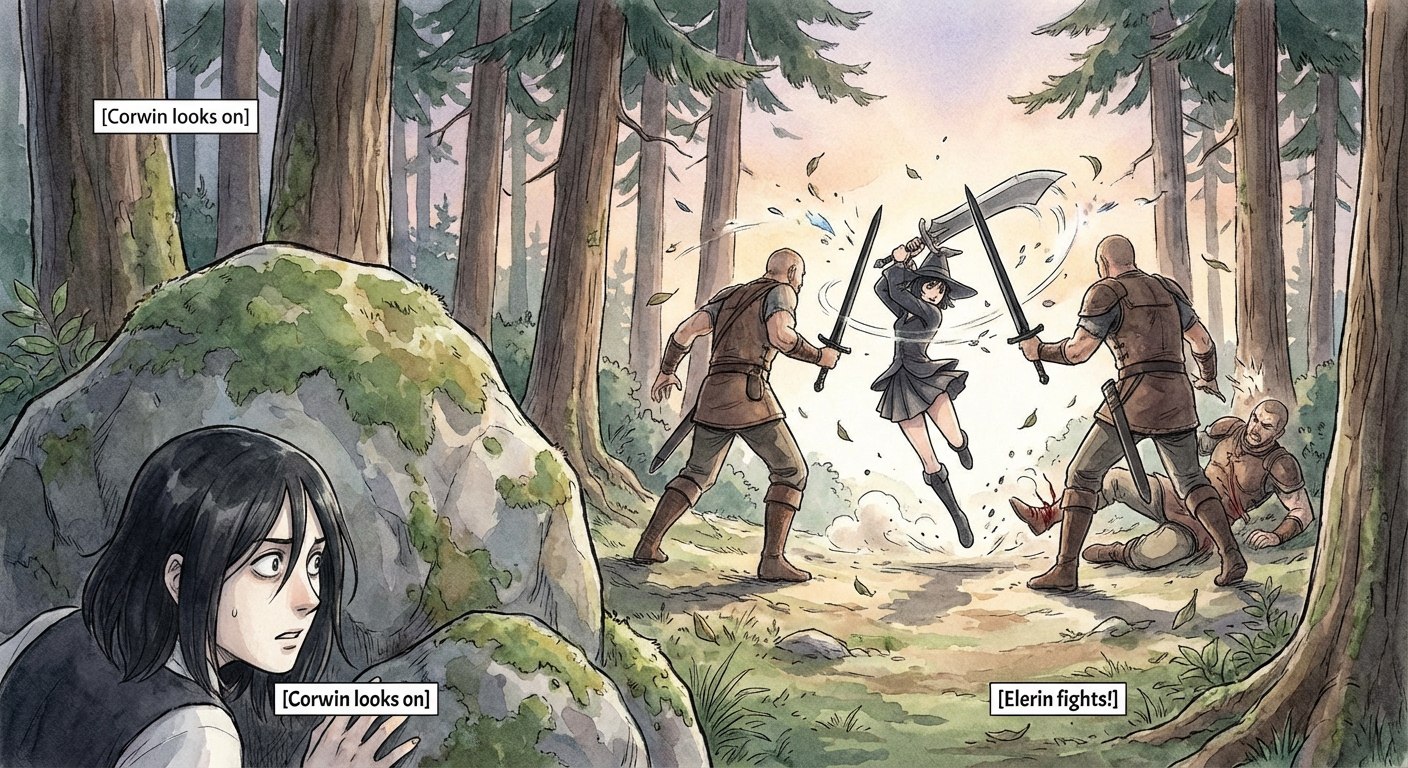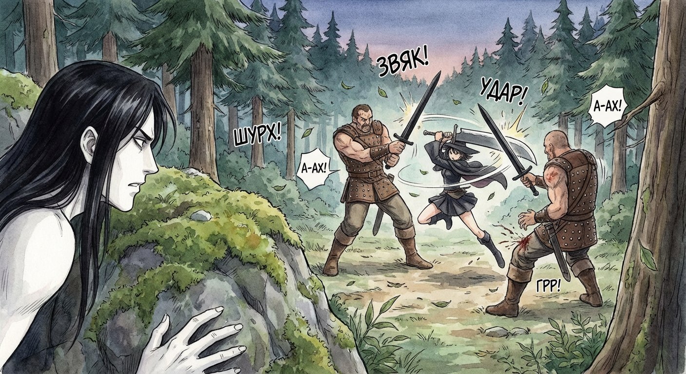 прода: Клинок девушки со свистом рассек воздух, мелькнув серебристой дугой. Широкоплечий бандит схватился за бедро, где уже расползалось темное пятно. Рана была неглубокой, и, похоже, только разозлила его. Он бросился в атаку с еще большей яростью. Девушка отразила выпад, и клинки сцепились с пронзительным скрежетом. — Дьяволица! — прохрипел раненый, оступившись на шаг. — Ты заплатишь своей кровью за мою, но сначала... я повеселюсь с тобой по полной! Отработаешь всеми дырами, а будет мало — сделаю новые! Слышишь? Фраза, грубая и отвратительная, повисла в воздухе. Корвин, как говорил Арнольд, «уронил забрало». Осторожность после произнесенных грязных угроз исчезла. Это были не стражники и не солдаты, а разбойники, и с ними нужно поступать как с разбойниками. Корвин не стал кричать, благородно привлекая внимание, как честный рыцарь. Тенью бросившись вперед, он быстро добрался до нападавших. Нож Фунгуса уже был в руке — холодное лезвие, готовое к бою. Раненый бандит заметил движение и инстинктивно развернулся, поднимая меч. Его блок был точным, но раздался неожиданный звук — не звон или скрежет, а короткий влажный щелчок. Старый меч, верно служивший долгое время, раскололся пополам, как гнилой сучок. Верхняя часть улетела в мох, сделав пару оборотов. Глаза бандита округлились от недоумения, когда он встретился с холодным взглядом Корвина. Юноша не колебался ни секунды. Нож вонзился в грудь разбойника, пробив металлические нашивки и кожу доспеха. Корвин не был искусным убийцей, но попал точно в жизненно важное место. Бандит рухнул на колени, а затем упал на бок, словно решил внезапно отдохнуть. Второй бандит отвлекся, глядя на напарника, что стало его роковой ошибкой. Тесак девушки описал короткую дугу и вонзился в шею нападавшего выше защиты. Удар был точным, будто хирургическим. Хриплое бульканье — и второй бандит рухнул, захлебнувшись собственной кровью. На поляне воцарилась тишина. Только прерывистое дыхание девушки и крики птиц в кронах деревьев напоминали, что время не стоит на месте. Дева-воительница держала окровавленный тесак наготове, внимательно следя за Корвином. Он молча убрал нож. Она медленно опустила оружие и выпрямилась. Ее голубые, почти синие в тени глаза смотрели настороженно, как у хищника. Корвин поднял руки, показывая, что не собирается нападать. — Кинжал интересный, — сказала она, смахивая каплю чужой крови со щеки. — Чей он? — А твой меч тоже интересный, — ответил Корвин. — Похож на огромный кухонный нож. — Это фальшион, — пояснила она. — Не люблю мечи, они только для убийств. Она подняла тряпку, оброненную бандитами, и вытерла лезвие тесака, затем убрала его за спину. Фальшион каким-то образом уменьшился и закрепился где-то между лопаток. Корвин вынул свой клинок, намереваясь тоже привести его в порядок, но волшебный металл был чист и идеально отполирован. Он заметил взгляд девушки и протянул свой нож ручкой вперед. Она взяла его двумя пальцами, осторожно, словно ядовитую змею, и осмотрела со всех сторон, а затем вернула. — Тот, кто его делал, хорошо разбирается в магии, — заметила она. — Рунные скрипты не каждый умеет писать. — Мастер Фунгус, он сильный маг, — ответил Корвин, надеясь, что это имя что-то скажет девушке. — Фунгус? Впервые слышу, — пожала она плечами. — А меня зовут Элерин. Я маг и авантюристка. — Ведьма? — 