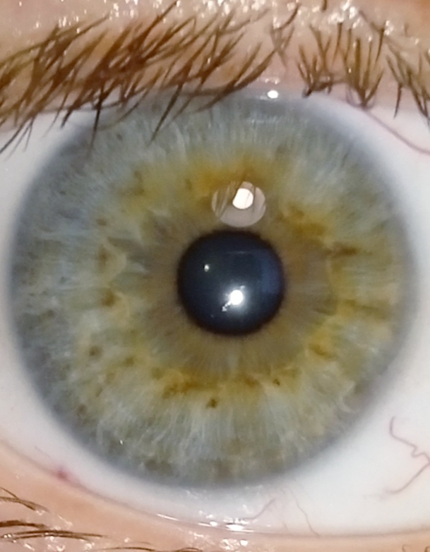 Радужка серая, вокруг зрачка примесь карего. Формально, глаз серо-карий, но голосовал на серый. Потому что глаз на самом деле – серый!