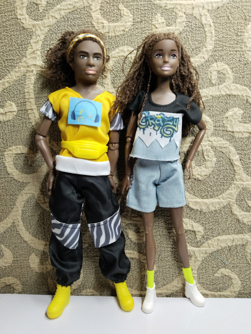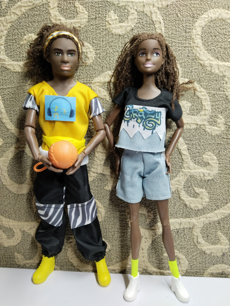 Мейк, конечно, простоватый, но! У них настоящие волосы, не пластик, афрокосички из очень мягкого шнура. И шарнирные хорошие тела. Да, пластик легкий, но у парня даже колени двухшарнирные, гнутся отлично! Девочка попроще. Аутфит крутой. Аксессуары есть! Повязка на голову, сумочка на пояс и сменные наклейки на майку на липучках. Обувь тоже есть. Парень может сам стоять. Парня звать Бобби. А девочке надо имя придумать. Но она оторва. #фото #куклы #шопоголизм ![]() ![]() ![]() ![]() ![]() 7 февраля в 18:56