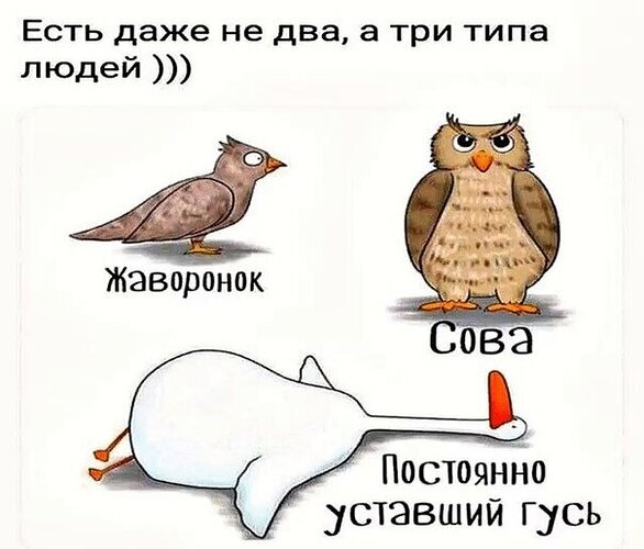Это ж про то, во сколько ложишься (для сов) ))) (Я чот подумала, что во сколько просыпаешься в выхи)))_) Тогда я точно минимум сова (это база, так скажем))_), а то и хардкорная, и бывает ультрахардкорная сова... Причем легкооо могу зачитаться фиклом и лечь в 2 ночи, и в 3, и 4 даже... И такое бывало не только в выхи, но и в рабочие дни... Дни, когда вообще не спала - ооооч редко, но таки бывало (в основном раньше)... 1 |