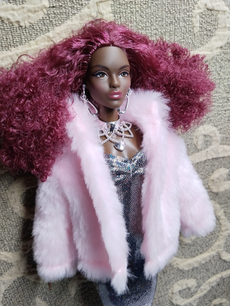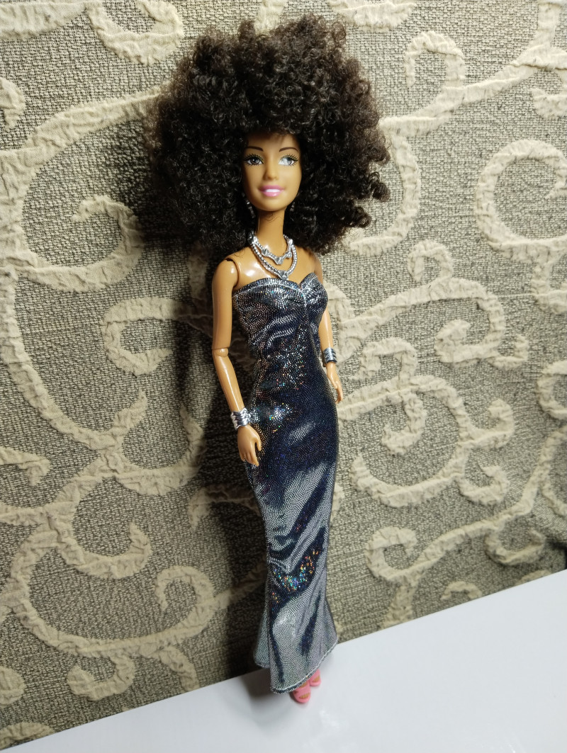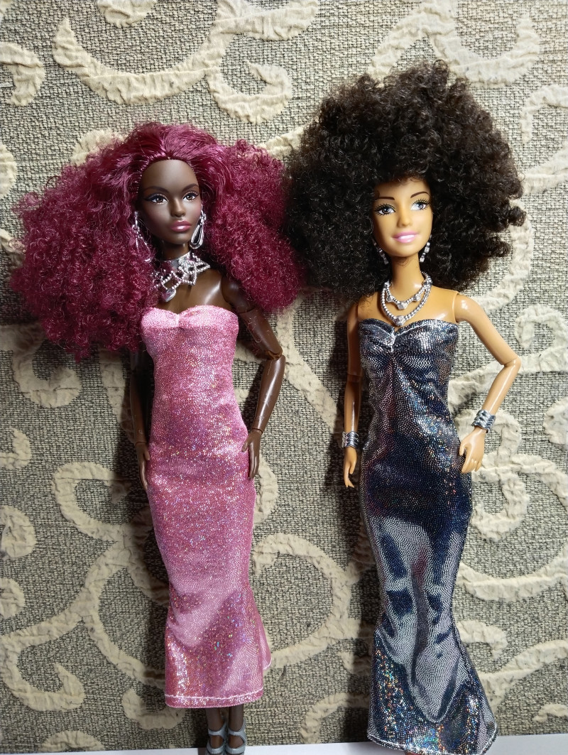 Платья из блестящего бифлекса, формата футляр. Максимально простые, кукла в них может только стоять. Но милые.