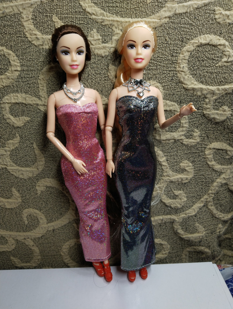 Вопщем, я рискнула купить пару кукол в вечернем платье и с ожерельями и туфлями. Колье красивые, под серебро. Мне такие нужны. Туфли тоже хорошие, резиновые, удобно надевать.