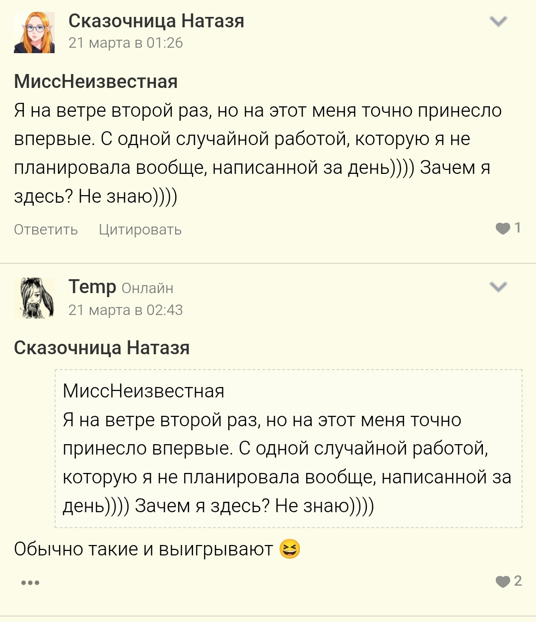 Я не планировала приходить на конкурс - вот уж честно. Просто всегда считала, что тема востока - не моя. Ну или не совсем моя. А потом пришла идея. Случайно. И та, которую не принести никуда больше. Написалась очень быстро, буквально за сутки - вот вдохновение поперло-то. И отправила. Параллельно зашла в болталку, скромно сказала, что я там так, чисто ради процесса (потому что работа не победная, как мне казалось). Я даже не планировала писать деанон, просто анонимность снять)) И победила. Сижу в шоке. Нет, мне нравилась и нравится моя работа, но это было неожиданно. Конечно же, я обрадована😊 А работа моя вот: Тень Юи Огромное спасибо всем проголосовавшим, оставившим комментарии - Никандра Новикова, Фоксиата, Птица Гамаюн, Georgie Alisa, Паутинка, Dart Lea, Теmр, EnniNova, Cabernet Sauvignon, за обзоры -ar neamhni, Тауриндиэ ! Мне есть над чем подумать, это был ценный опыт. За реки - благодарю отдельно -Фоксиата Паутинка Dart Lea .🥰😍 И, конечно же, благодарность нашим оргам и редакторам: Jas Tina , Кэй Трин , Lira Sirin . вчера в 22:22